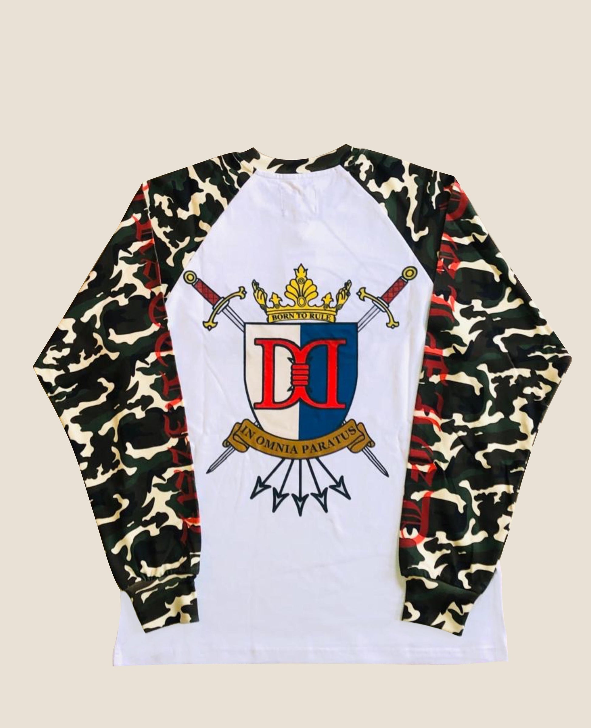 يحتوي على شعارنا المسجل بخط اليد مطرزًا على الصدر مع تفاصيل شعار ملكي عتيق مطبوع على الظهر، بالإضافة إلى اسم العلامة التجارية على الكم المموه.
