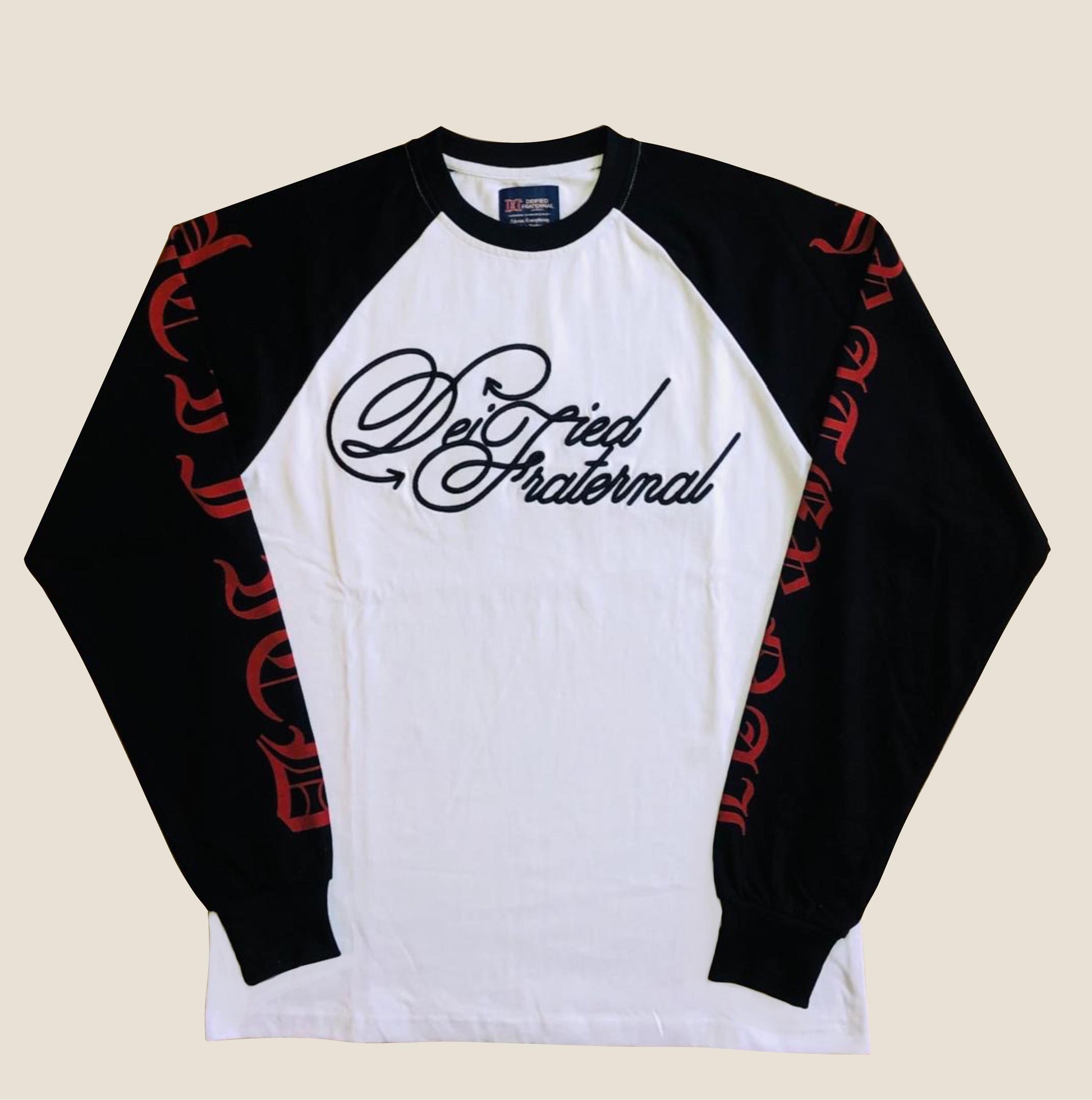 It’s has our trademarked cursive logo embroidered at the chest, with printed royal vintage crest details at the back, also brands name at the sleeve.
